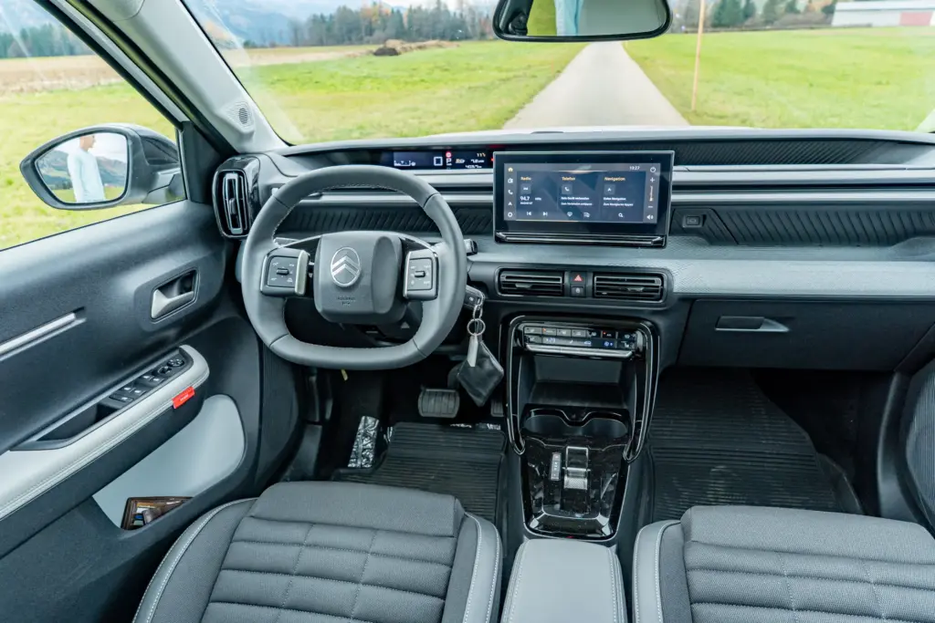 Das Cockpit entspricht vom Design her dem kleineren C3. Alles liegt gut im Blickfeld, das i-Cockpit erinnert an die Schwestermarke Peugeot. Das Lenkrad ist sehr klein sowie oben und unten abgeflacht, liegt aber sehr gut in der Hand. Ab der zweiten Ausstattungslinie „Plus“ ist ein 10,25 Zoll großes Infotainment-Display mit an Bord, bei der Topvariante „Max“ inklusive Navi. Ebenfalls serienmäßig in dieser Version ist eine praktische Ablage mit induktiver Ladefunktion für das Handy. Insgesamt ist alles klar strukturiert, und auch Ungeübte sollten mit der Bedienung nicht überfordert sein. Retrofans werden sich freuen: Anstelle eines Startknopfes kommt der C3 mit klassischem Zündschlüssel. Auch die Materialanmutung präsentiert sich recht ordentlich, vor allem im Hinblick auf das Preisniveau. Schwarzer Kunststoff wird mit hellen Textilflächen und anderen Elementen aufgelockert.
