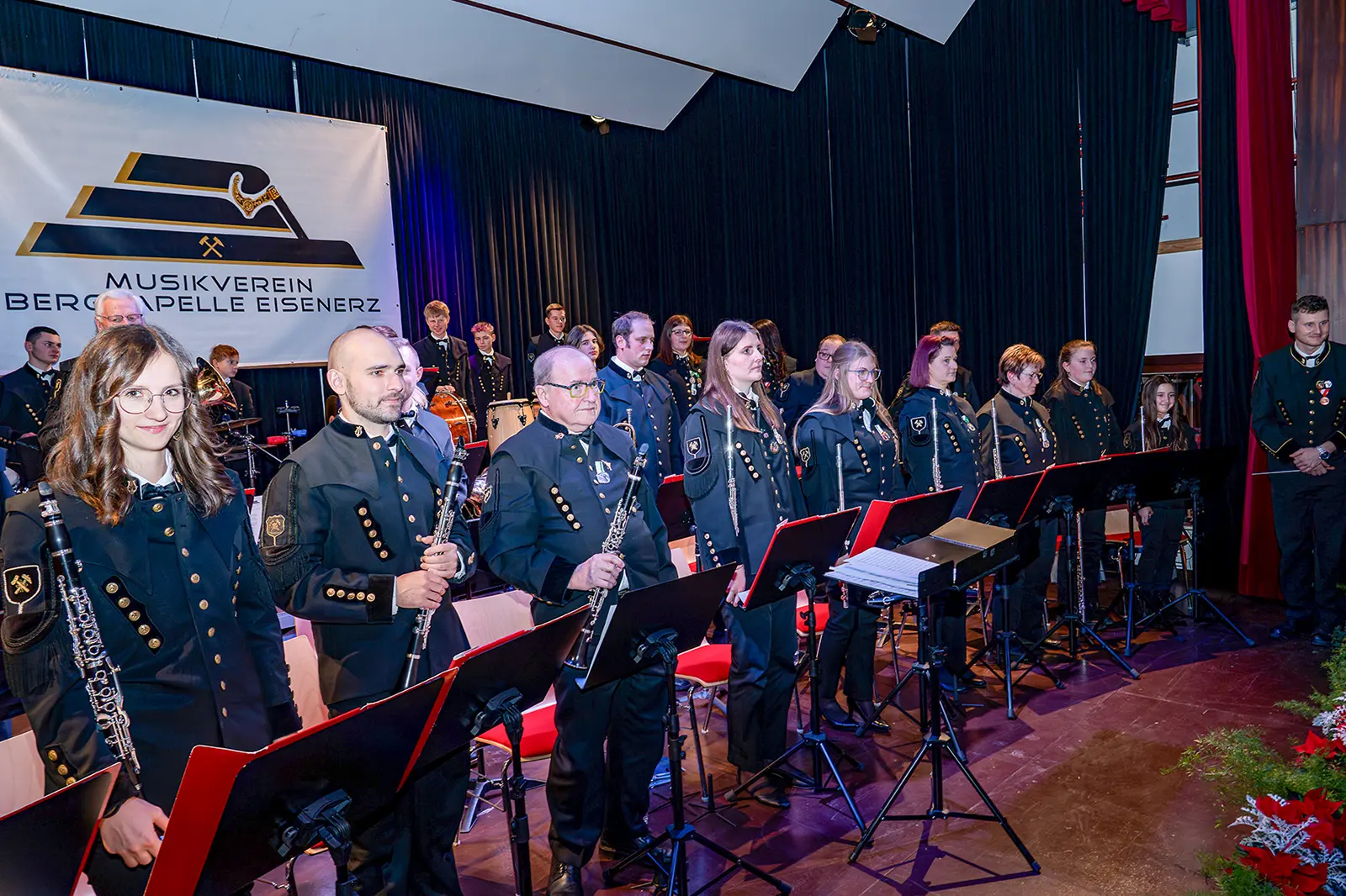 Vor vollem Haus fand zum Abschluss des vergangenen Jahres das traditionelle Weihnachts- und Neujahrswunschkonzert der Bergkapelle Eisenerz statt. Unter der Leitung von Florian König und Stefan Stromberger präsentierten die MusikerInnen im Innerberger Gewerkschaftshaus ein abwechslungsreiches Programm, das von klassischen Werken bis zu modernen Weihnachtsliedern reichte. Zwischen den Stücken sorgte Petra Loitzl mit ausgewählten Gedichten für weitere besinnliche Momente. Ein besonderer Höhepunkt der Veranstaltung war die Ehrung verdienter Mitglieder und Funktionäre. Besonderen Applaus erntete dabei Thomas Kurzmann, der für sein 25-jähriges Wirken im Musikverein gewürdigt wurde.