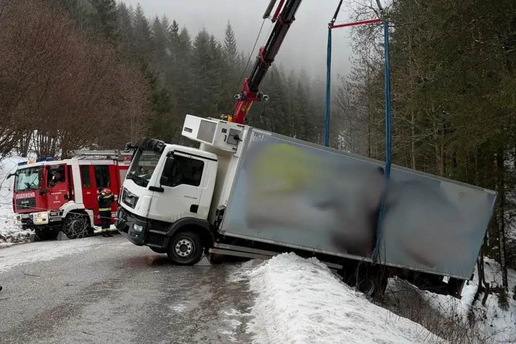 Auf der eisglatten Brunnalmstraße schlitterte ein Lebensmitteltransporter von der Fahrbahn, die Feuerwehr rückte zur Bergung aus.