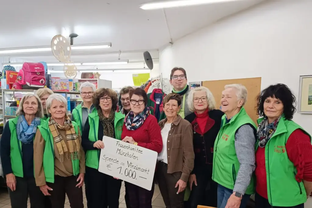 Über eine Spende vom Frauenkomitee Mürzhofen in Kindberg in Höhe von jeweils 1000 Euro durften sich der Vinzimarkt in St. Barbara-Wartberg und das Hospizteam Mürztal freuen. Das Geld stammt aus dem Erlös des von den Damen im vergangenen Advent durchgeführten Weihnachtsbasars. Die Übergabe erfolgte durch die Vorsitzende des Frauenkomitees Adelheid Jungbauer und Monika Maier an Roswitha Fraiss und Ingrid Willingshofer vom Hospizteam sowie die MitarbeiterInnen des Vinzimarktes.