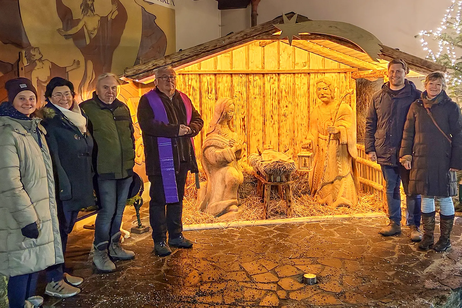 Drei Frauen und drei Männer vor einer lebensgroß aus Holz angefertigten Krippenszene
