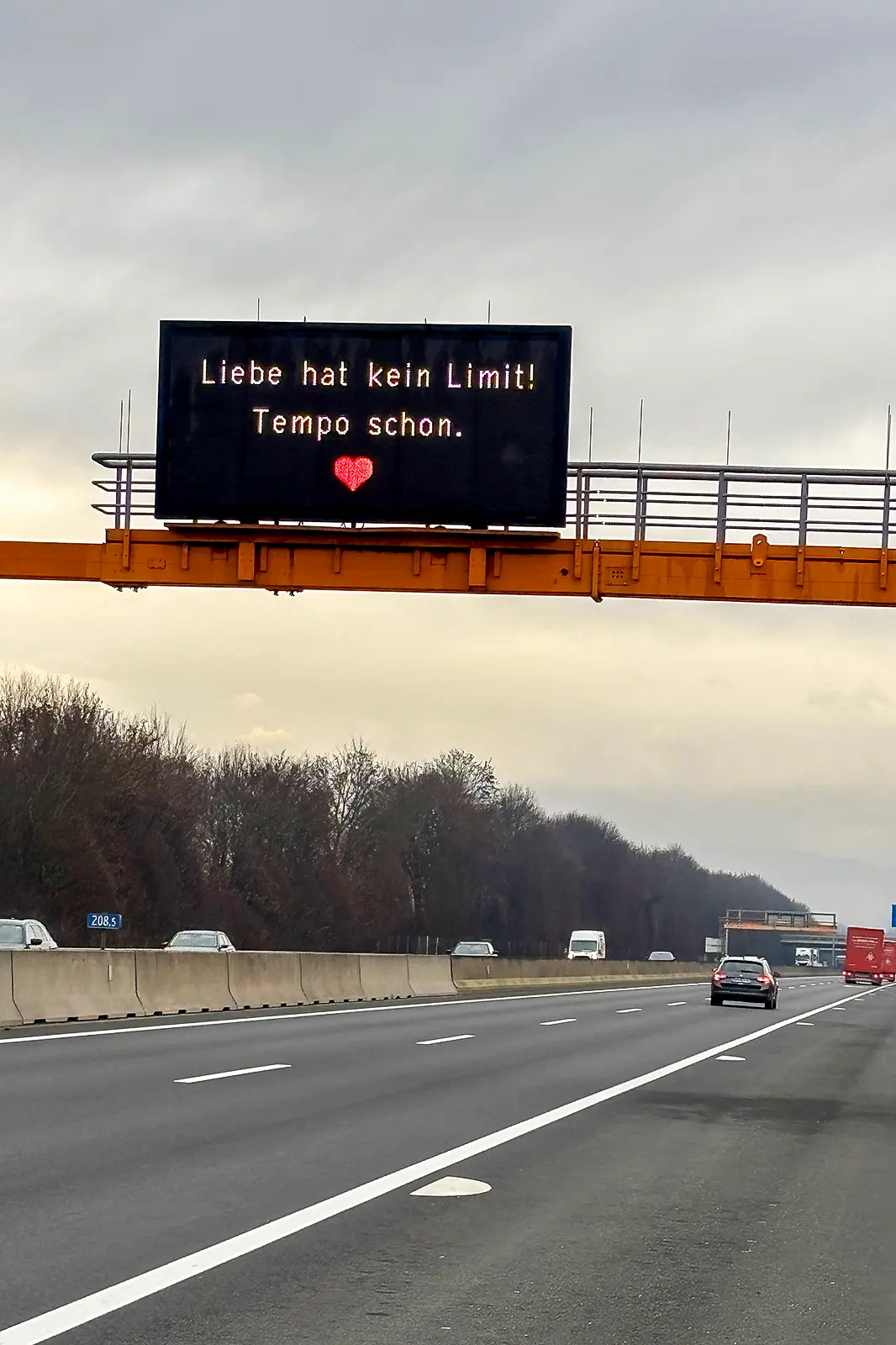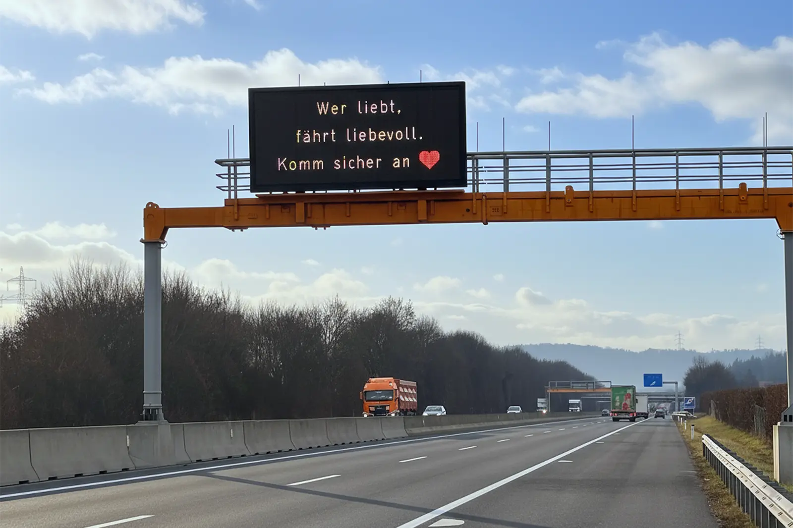 Ein großes Überkopfschild an einer Autobahn, darauf ein rotes Herz und der Text "Wer liebt, fährt liebevoll. Komm sicher an"