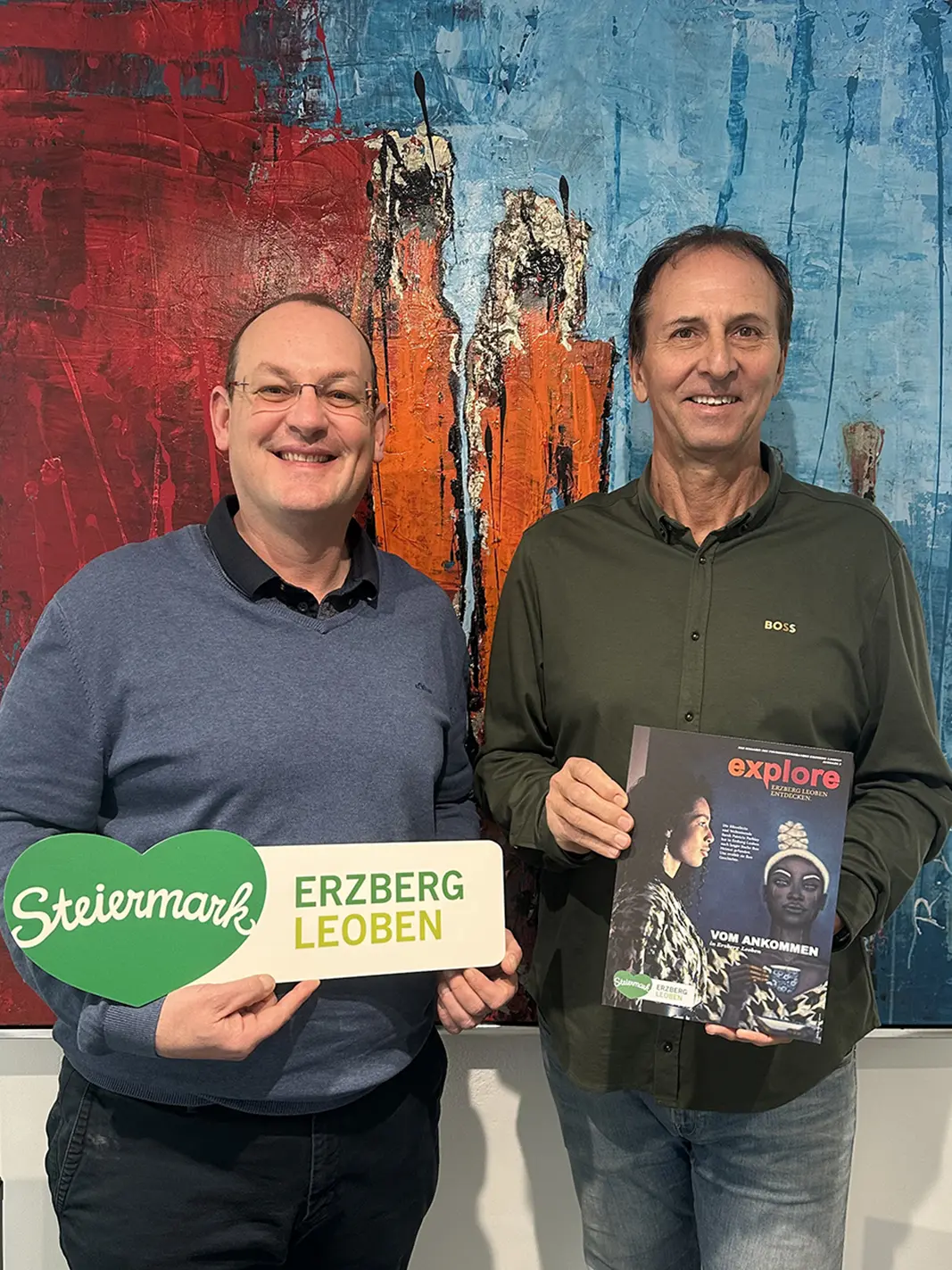 Geschäftsführer Markus Leitner (li.) und Vorsitzender Rudolf Tischhart vom Tourismusverband Erzberg-Leoben mit der neuen Ausgabe des Magazins „Explore“. Foto: Mandl