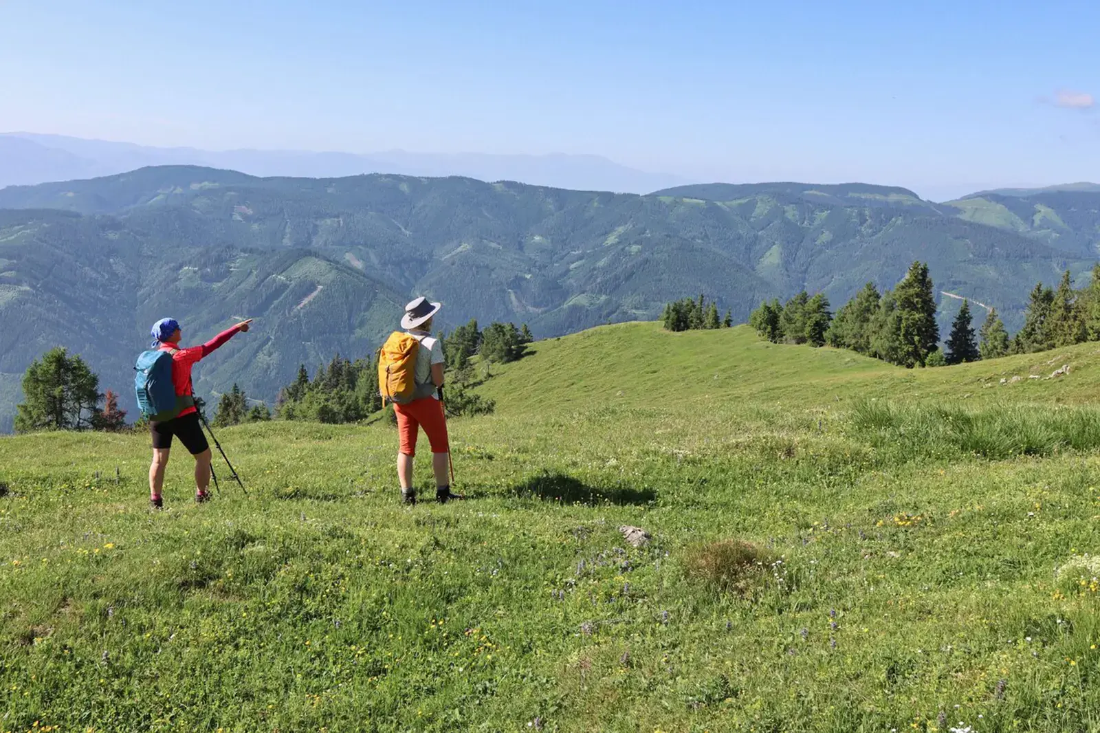 Zwei Wanderer auf einer Bergwiese zirka an der Baumgrenze, den Blick auf bewaldete Hänge auf der anderen Seite des Tals gerichtet