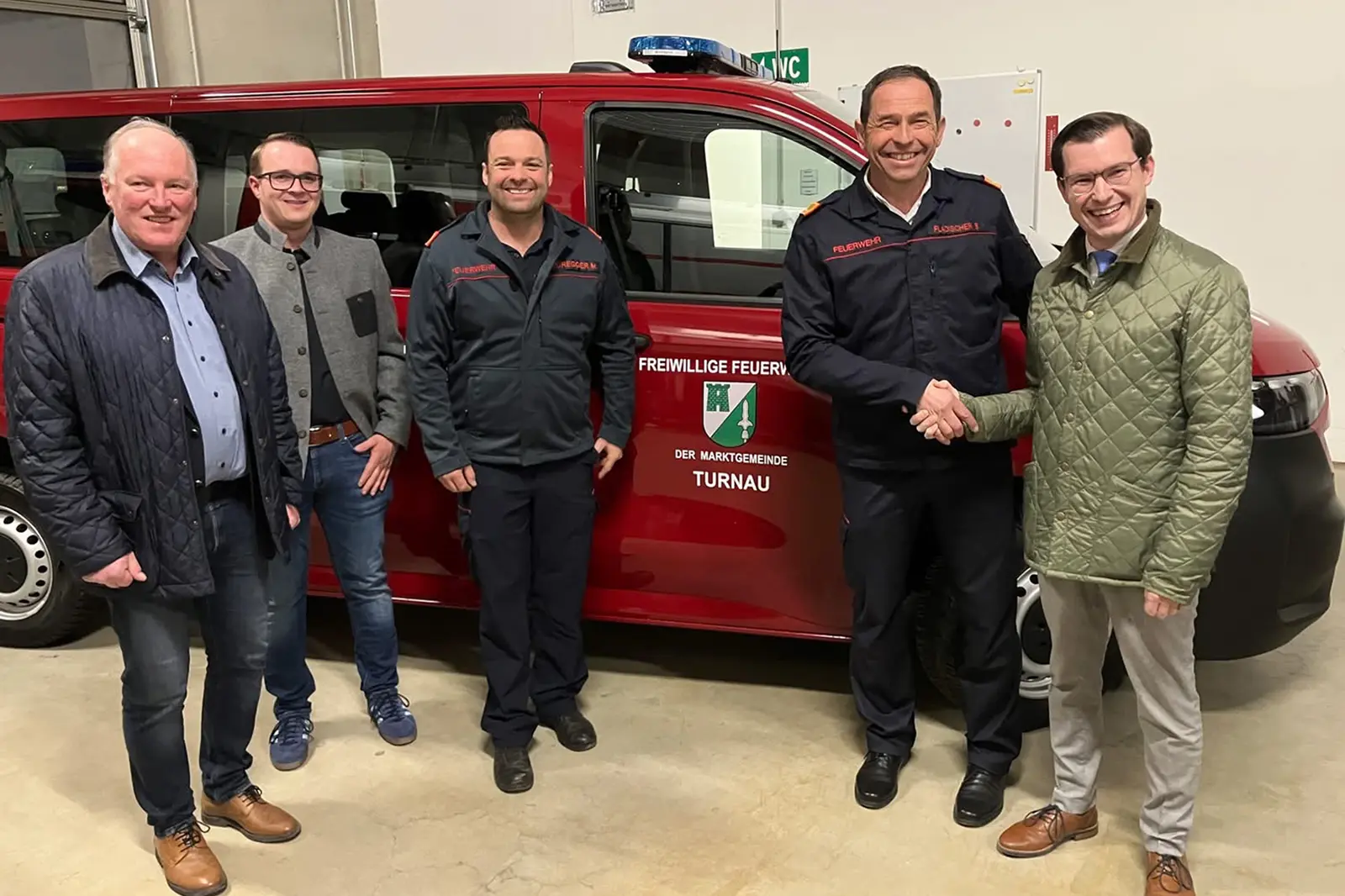 Bei einer kleinen Feier im Rüsthaus der Freiwilligen Feuerwehr Turnau wurde ein neues Mannschaftstransportfahrzeug offiziell in Dienst gestellt. Mit dieser Anschaffung wurde die Erneuerung des Fuhrparks nun endgültig abgeschlossen. Kommandant Bernd Fladischer und sein Stellvertreter Matthias Puregger konnten mehrere Ehrengäste zu diesem Anlass begrüßen, darunter auch Bürgermeister Stefan Hofer, Vize Berthold Strobl und Lukas Diepold vom gleichnamigen Autohaus, das die Feuerwehr bei der Anschaffung und den notwendigen Einbauten unterstützte.