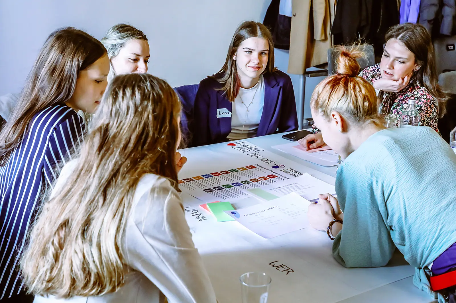Sechs Jugendliche sitzen um einen mit Papieren bedeckten Tisch