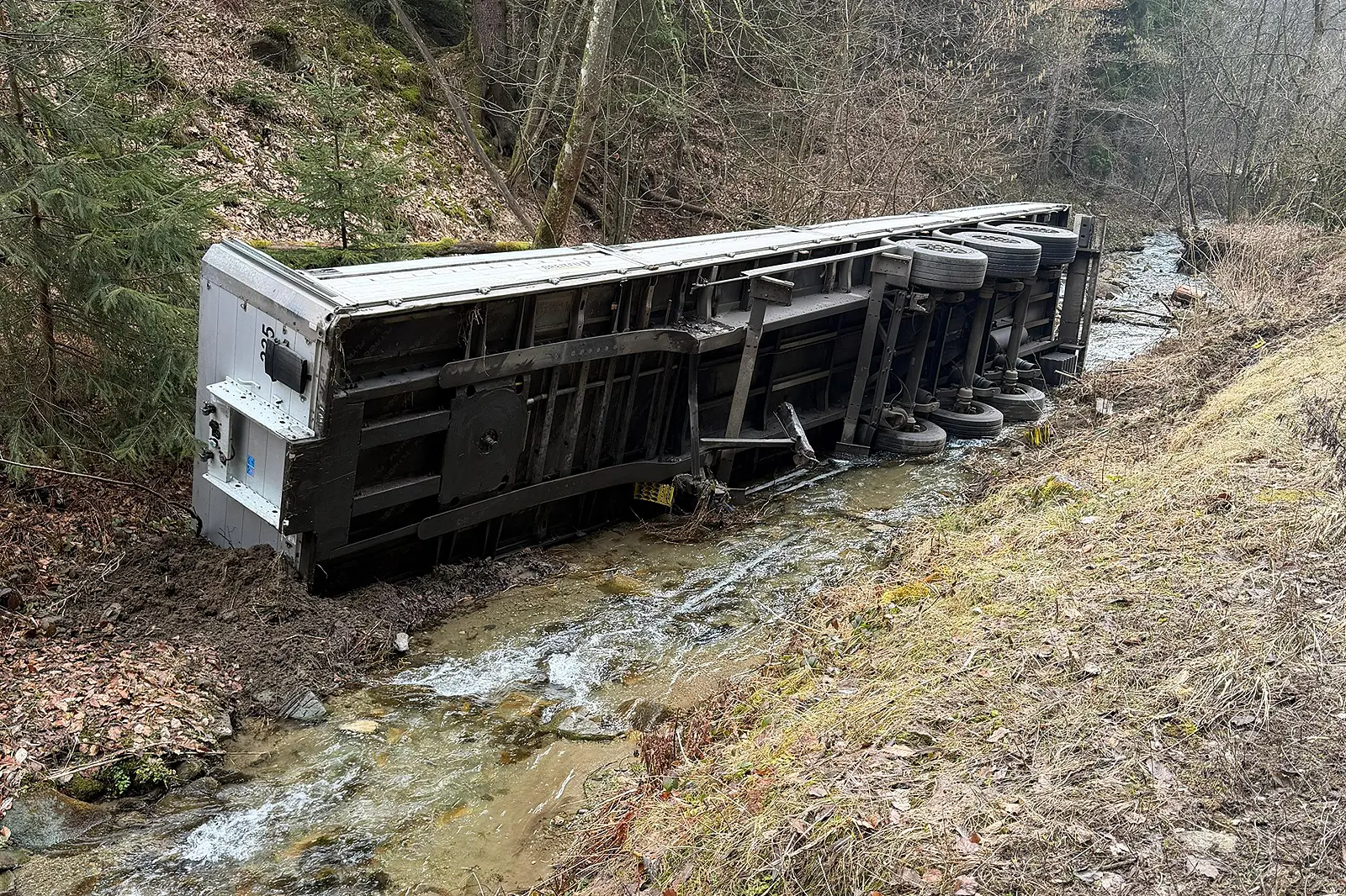 Auf der Stollinggrabenstraße in St. Lorenzen im Mürztal kam es am Morgen des 3. März zu einem Unfall. In einer Linkskurve löste sich aus bislang ungeklärter Ursache ein Sattelauflieger vom Zugfahrzeug. Der mit leeren Metallboxen beladene Auflieger kam seitlich im angrenzenden Bachbett zum Stillstand. Personen wurden bei dem Vorfall nicht verletzt.
