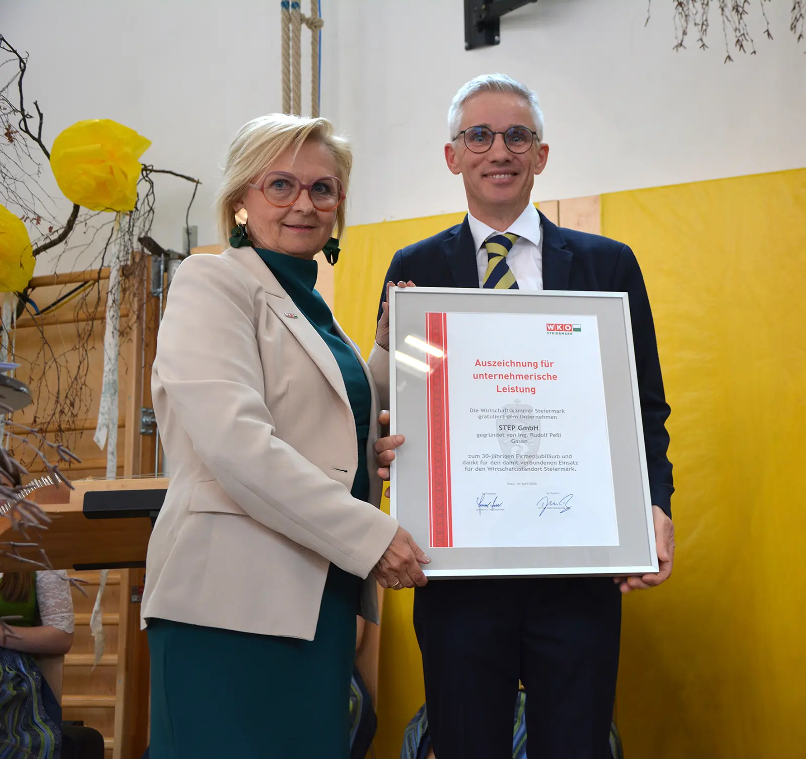 Ein besonderes Augenmerk liegt bei der STEP GmbH auf den Mitarbeitenden. Viele wurden im eigenen Betrieb ausgebildet und sind seit Jahren Teil des Unternehmens. Auch Bürgermeister Erwin Gruber würdigte das Unternehmen und seine Bedeutung für Gasen: „STEP GmbH ist ein Paradebeispiel dafür, wie Innovationskraft und regionale Verwurzelung zusammenpassen. Das Unternehmen hat in den letzten 30 Jahren nicht nur Arbeitsplätze geschaffen, sondern Geschäftsführer Rudolf Peßl hat auch gezeigt, wie man mit Mut und Weitblick neue und erfolgreiche Wege gehen kann. Wichtig war ihm dabei aber immer auch die Zeit mit seiner Familie, bei der er großen Rückhalt gefunden hat.“ Für diese Leistungen wurde Peßl mit der Goldenen Ehrennadel der Gemeinde Gasen ausgezeichnet. Zudem gratulierte Vizepräsidentin Gabriele Lechner von der Wirtschaftskammer Steiermark zum 30-jährigen Firmenjubiläum und dankte für den besonderen Einsatz für den Wirtschaftsstandort Steiermark mit einer Ehrenurkunde.