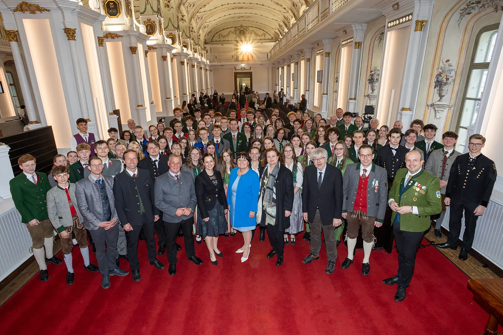 Eine große Gruppe von Personen steht in einem Festsaal.