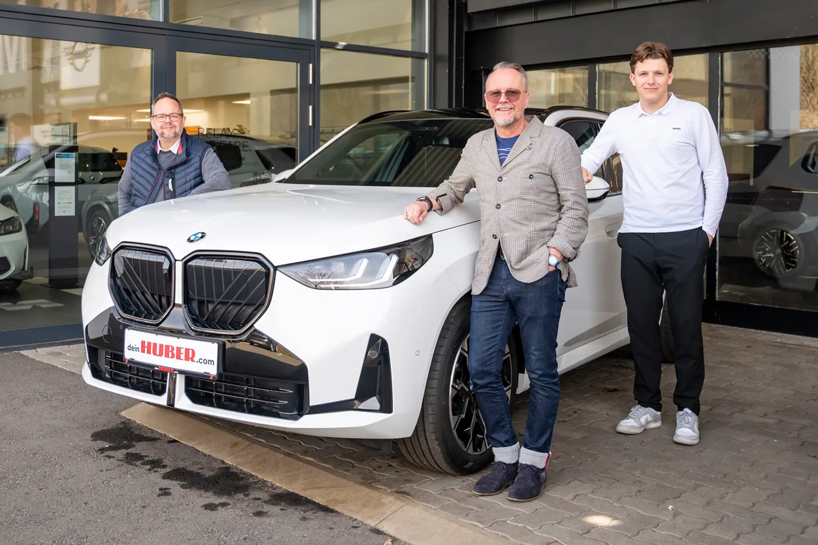 Andreas Kaiser, Harald Baumgartner und Marin Maric (v. li.) vom Autohaus Huber in Bruck mit dem BMW X3 xDrive30e. Foto: PA