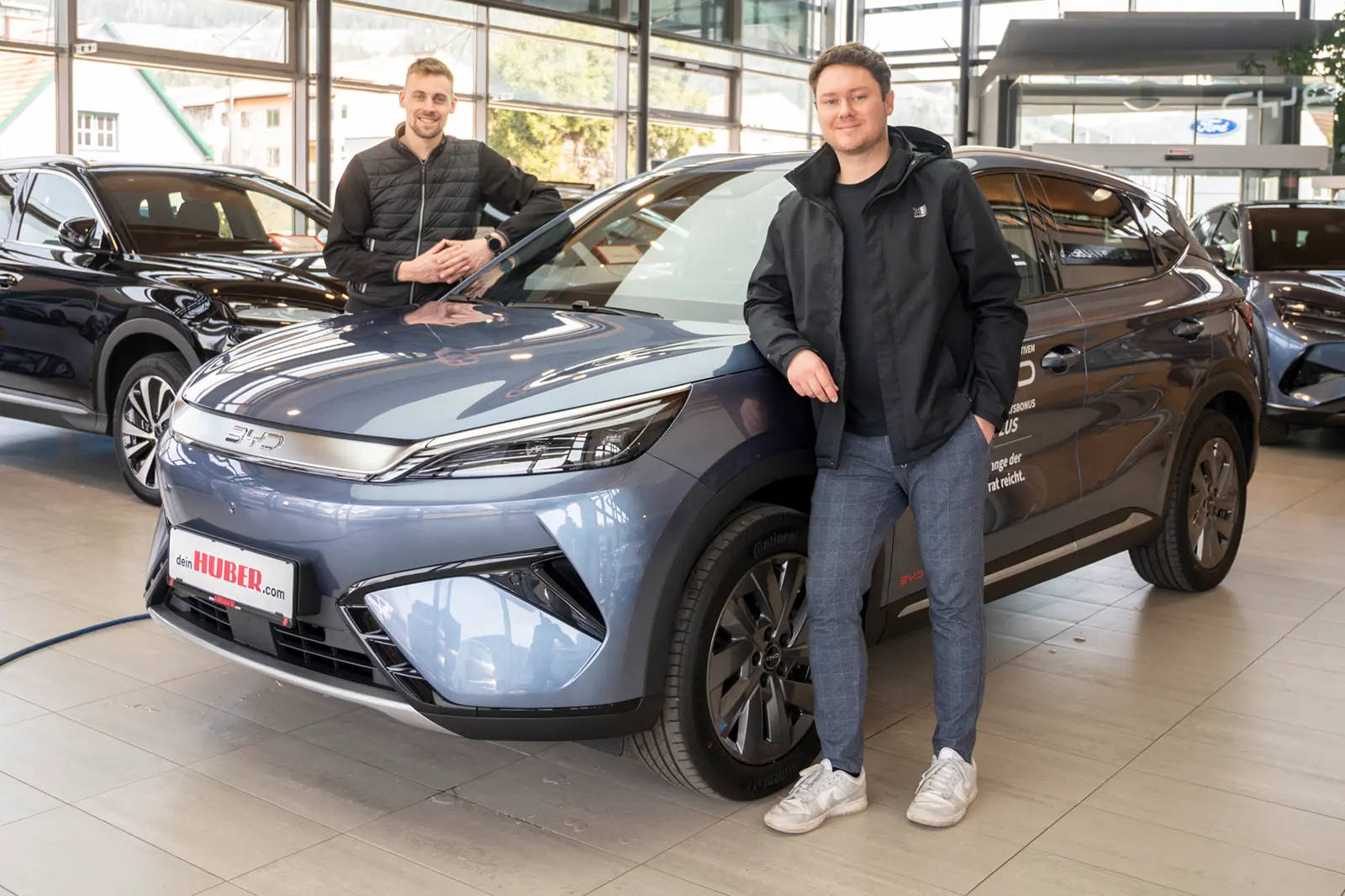 Sascha Hebenstreit (li.) und Robin Dollmann mit dem neuen BYD Atto 3, den das Autohaus Huber Kapfenberg zur Brucker Autoschau mitbringt. Foto: PA