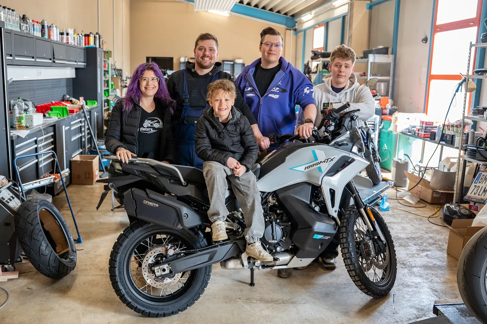 Paul Marcher mit Team und Familie am neuen Standort von PM Motors in Kapfenberg. Auf den Brucker Hauptplatz bringt er spannende Zweirad-Neuheiten mit. Foto: MaW
