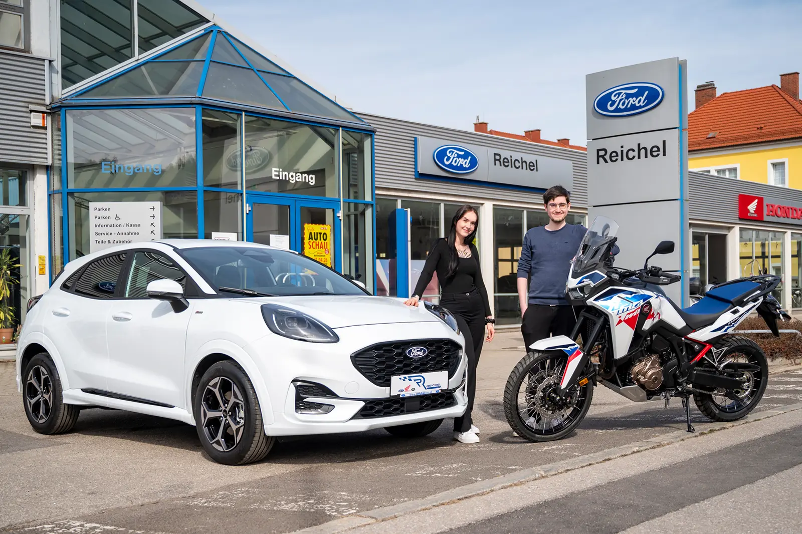 Lena-Sophie Rabl und Samuel Brunner vom Autohaus Reichel in Bruck beraten gerne zu den Modellen von Ford und den Motorrädern von Honda. Foto: PA