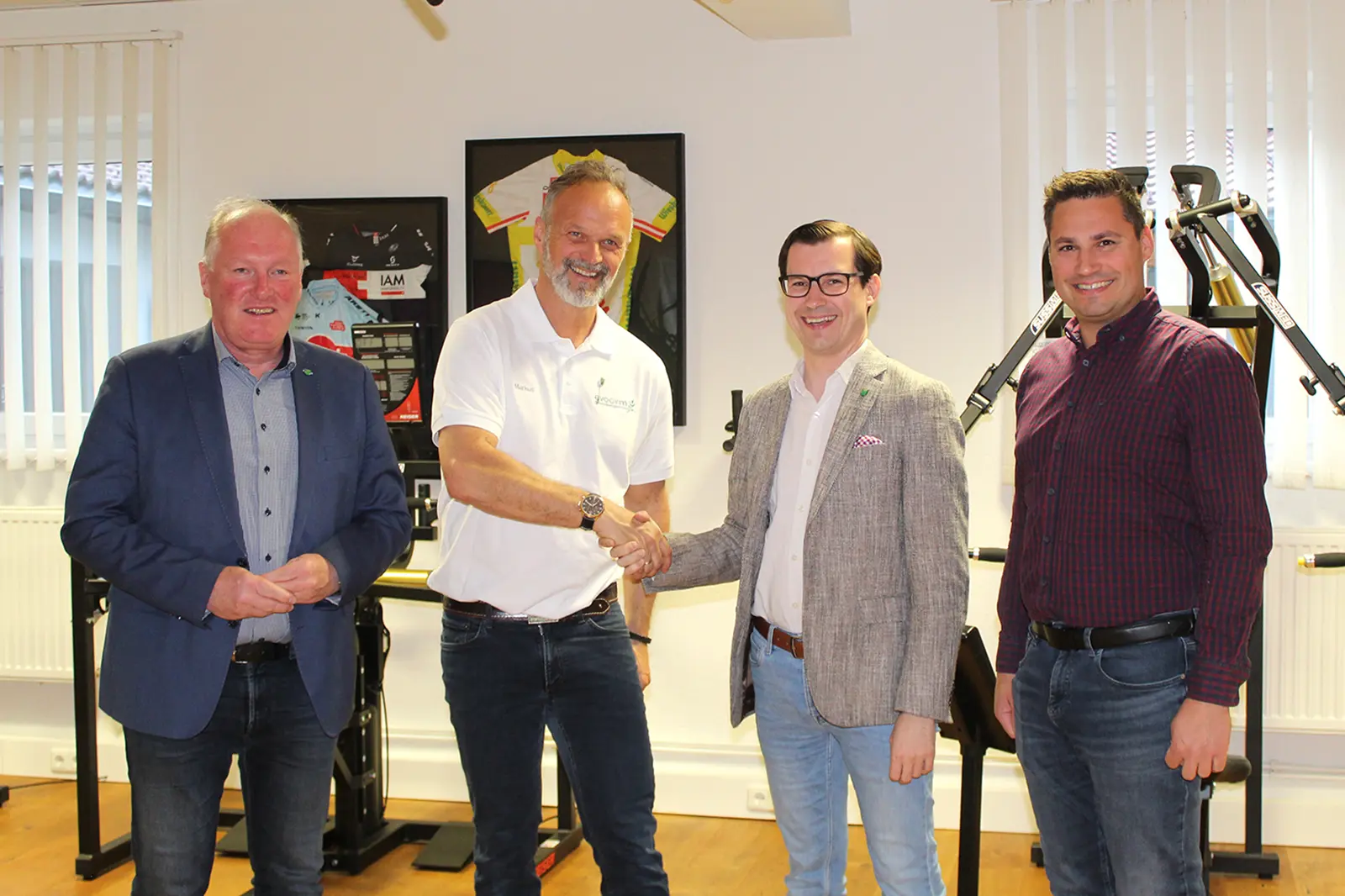 Vier Männer stehen in einem Raum mit Fitnessgeräten