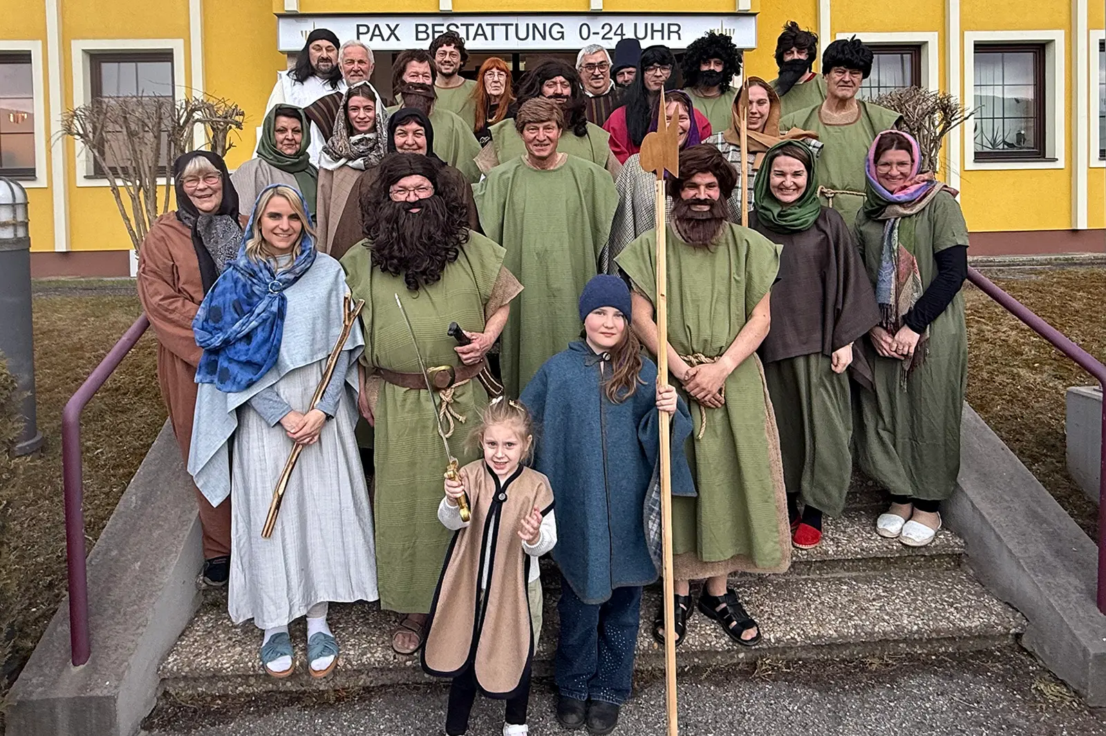 Eine Gruppe von Personen in Kostümen steht auf einer Treppe vor einem Gebäude
