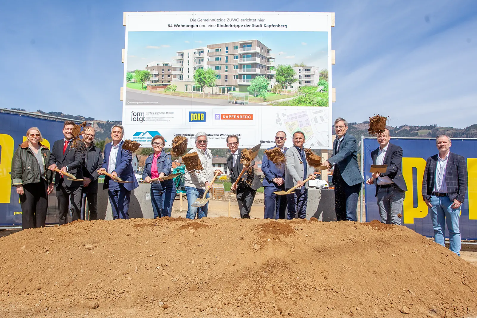 Dominierender Baustoff ist Holz, die Fertigstellung des ersten Abschnitts ist für Sommer kommenden Jahres geplant. Die Kinderkrippe soll somit ab Beginn des Schuljahres 2027/28 zur Verfügung stehen. Die Bauabschnitte zwei und drei starten zeitlich versetzt, sodass sie teils parallel laufen. Zieldatum für die Fertigstellung des Gesamtprojekts mit 84 Wohnungen ist Herbst 2028. Die geplante Investitionssumme beläuft sich auf rund 17 Millionen Euro. Anlässlich des offiziellen Baustarts griffen unter anderen Bürgermeister Matthäus Bachernegg, Vizebürgermeisterin Monika Vukelic-Auer, Obmann Helmut Krammer und Obmannstellvertreter Heinz Karelly von der Brucker Wohnbau zu den Spaten. Ebenso mit dabei waren unter anderen Stefan Eisenberger vom Generalunternehmen Porr, Michael Tesch vom Architektenteam „Formfolgt“, Stadtamtsdirektor Christian Theiss und der Leiter der Baudirektion Manfred Rössl.