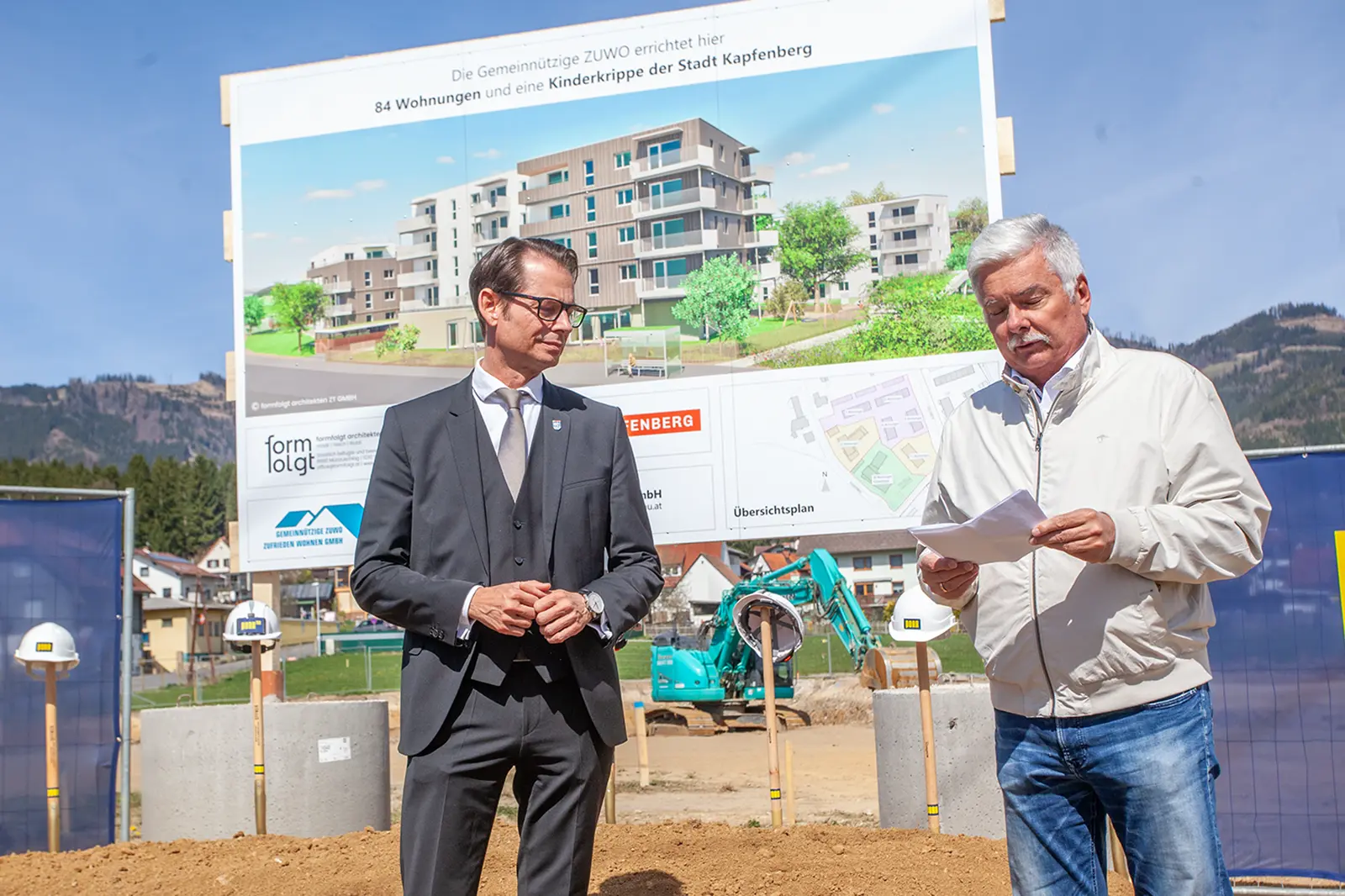Die gemeinnützige Zufrieden Wohnen GmbH, eine hundertprozentige Tochter der Brucker Wohnbau, errichtet in den kommenden Jahren 84 neue Wohnungen mit der Anschrift „Am Zöllbach“, eingebettet zwischen den Kapfenberger Stadtteilen Schirmitzbühel und Pogier. Vor kurzem fand der Spatenstich für den ersten Bauabschnitt statt. Er umfasst 26 Wohnungen sowie eine neue städtische Kinderkrippe.