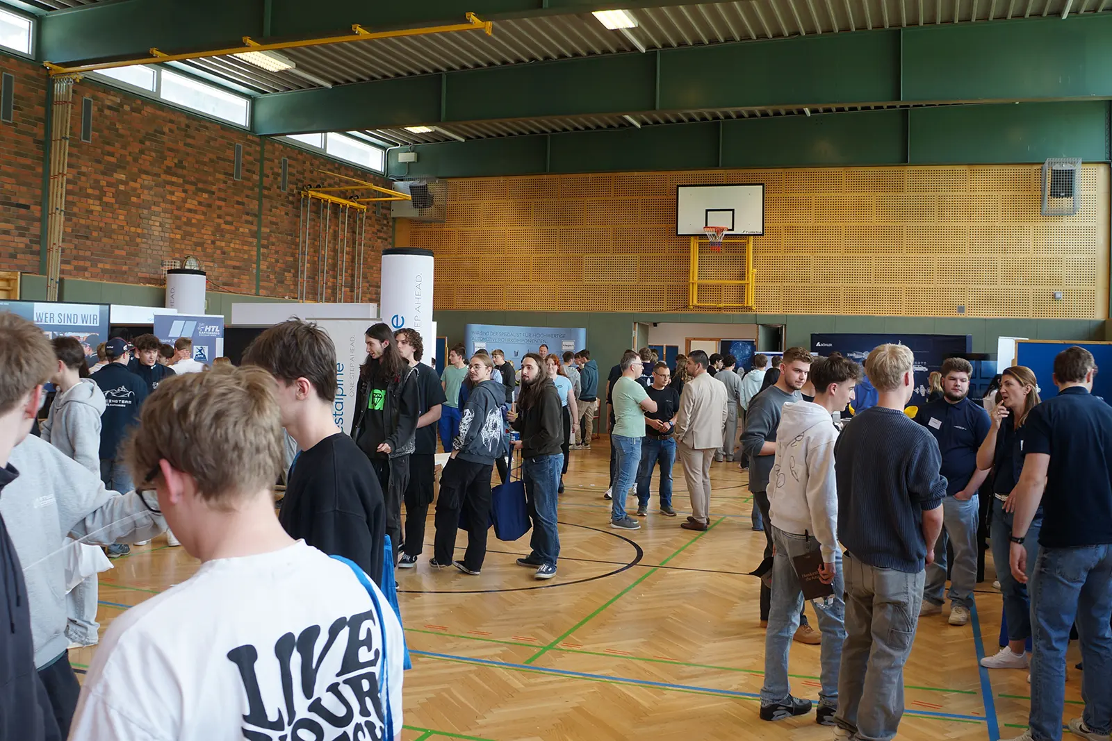 In den beiden Turnsälen konnten die SchülerInnen mit den Unternehmen in Kontakt treten. Foto: HTL Kapfenberg