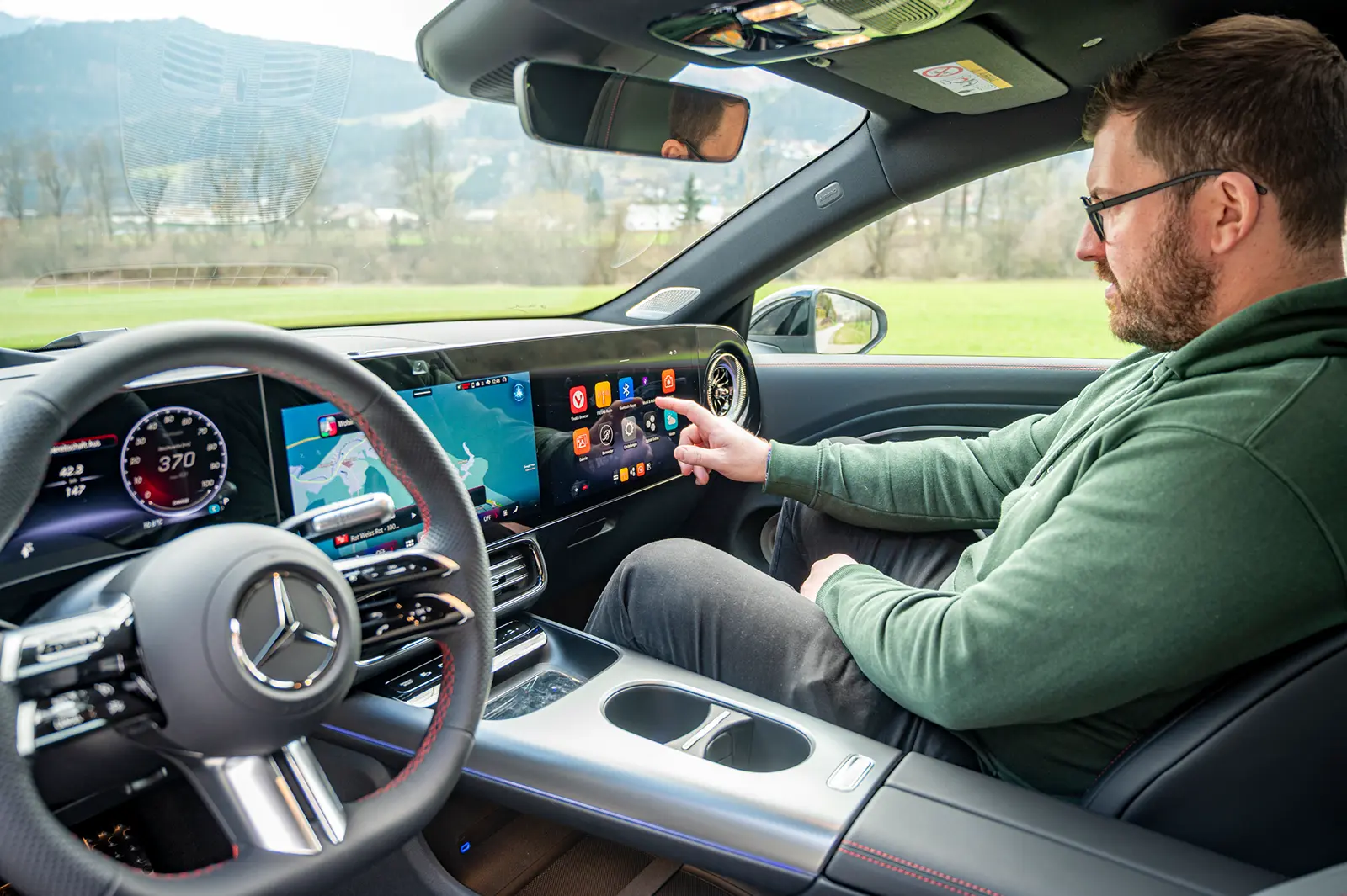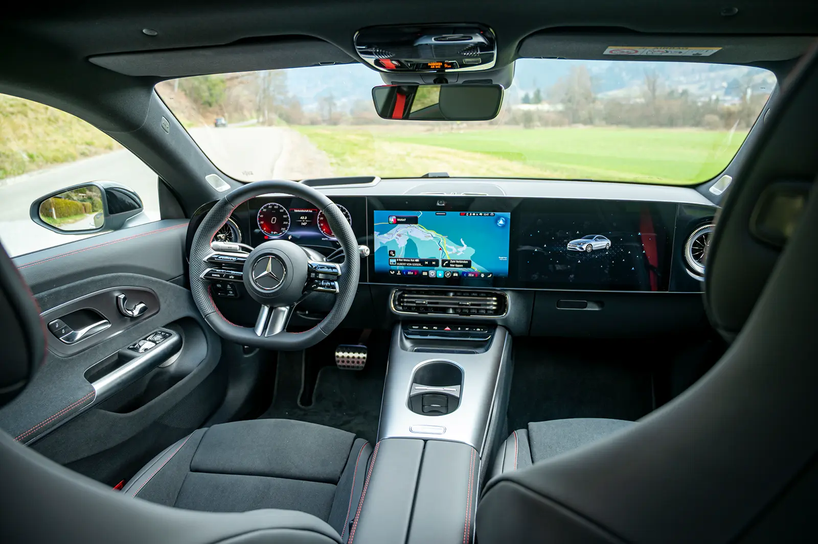 Innen zeigt sich der CLA so, wie man es erwartet: digital, modern und ein wenig futuristisch. Die großen Displays reagieren schnell, die Navigation denkt mit und plant Ladestopps sinnvoll ein, was gerade auf längeren Strecken ein echter Vorteil ist. Weniger überzeugend sind die Touchflächen am Lenkrad. Da fehlt einfach das Gefühl, das man von klassischen Tasten kennt. Man ertappt sich dabei, kurz hinzuschauen, und das sollte eigentlich nicht nötig sein. Überrascht hat uns dafür das Platzangebot. Denn von außen wirkt der CLA nicht unbedingt geräumig, innen relativiert sich das aber schnell. Auch im Fond finden Erwachsene ausreichend Platz, und der Kofferraum mit einem Volumen von 405 Litern sowie ein 101 Liter fassendes Abteil unter der vorderen Haube reichen für den Alltag völlig aus.
