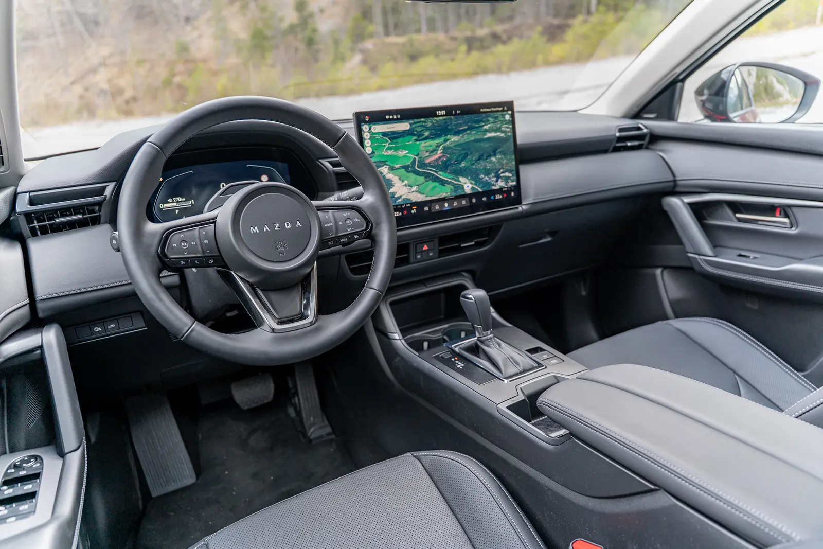 Innen geht Mazda einen klaren Schritt in Richtung Zukunft. Hier findet sich ein aufgeräumtes Cockpit mit großem Display und vielen digitalen Funktionen. Das neue Infotainment-System mit Google-Integration arbeitet schnell und zuverlässig, Navigation und Sprachsteuerung sind auf aktuellem Stand. Mazda verabschiedet sich im CX-5 fast vollständig von klassischen Tasten. Der Drehregler ist weg, vieles läuft über Touchbedienung. Das wirkt modern, braucht aber Eingewöhnung. Gerade während der Fahrt wünscht man sich manchmal den schnellen Griff zurück, da war das alte System nicht unbedingt schlechter.