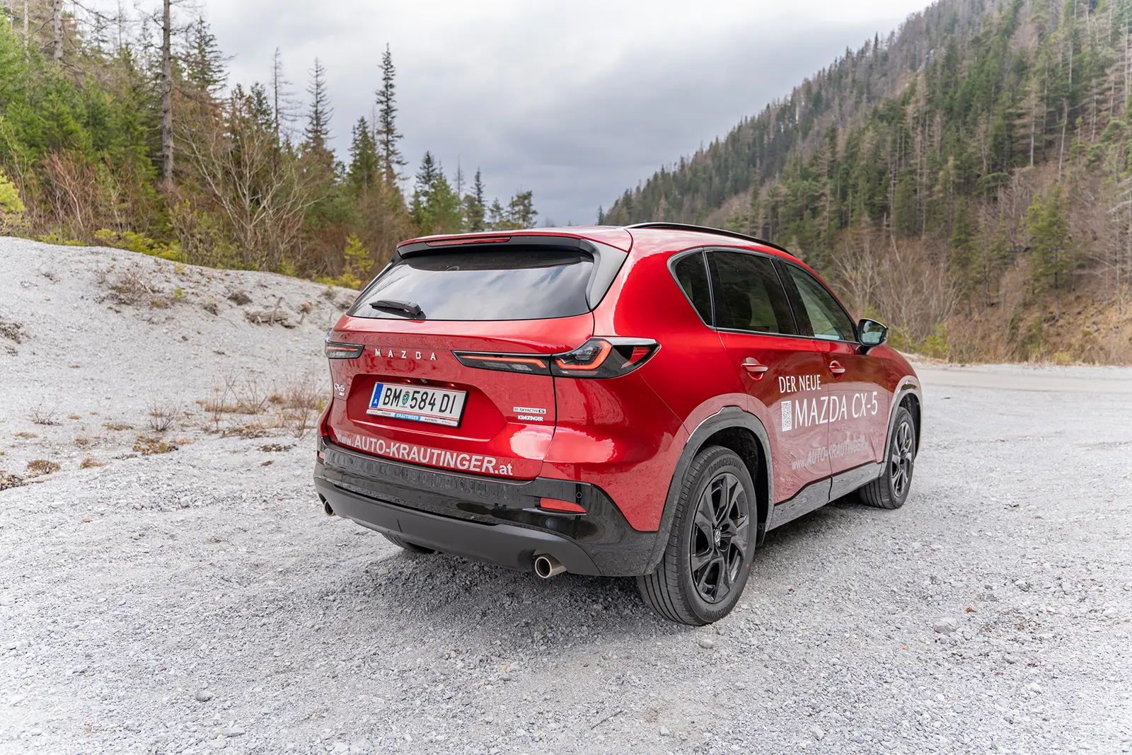 Beim Antrieb bleibt Mazda bewusst bodenständig. Als Antrieb arbeitet ein 2,5-Liter-Benziner mit 141 PS, unterstützt von einem 24-Volt-Mildhybrid-System, dazu gibt es serienmäßig eine Sechsgang-Automatik. Mehr Optionen gibt es nicht, dafür ist der CX-5 wahlweise mit Front -oder Allradantrieb erhältlich. Die Fahrleistung ist solide, in rund zehn Sekunden geht es von null auf 100 km/h, die Höchstgeschwindigkeit liegt bei 187 km/h. Das sind 13 km/h Spitze weniger als beim Vorgänger – für den Betrieb in Österreich komplett irrelevant.